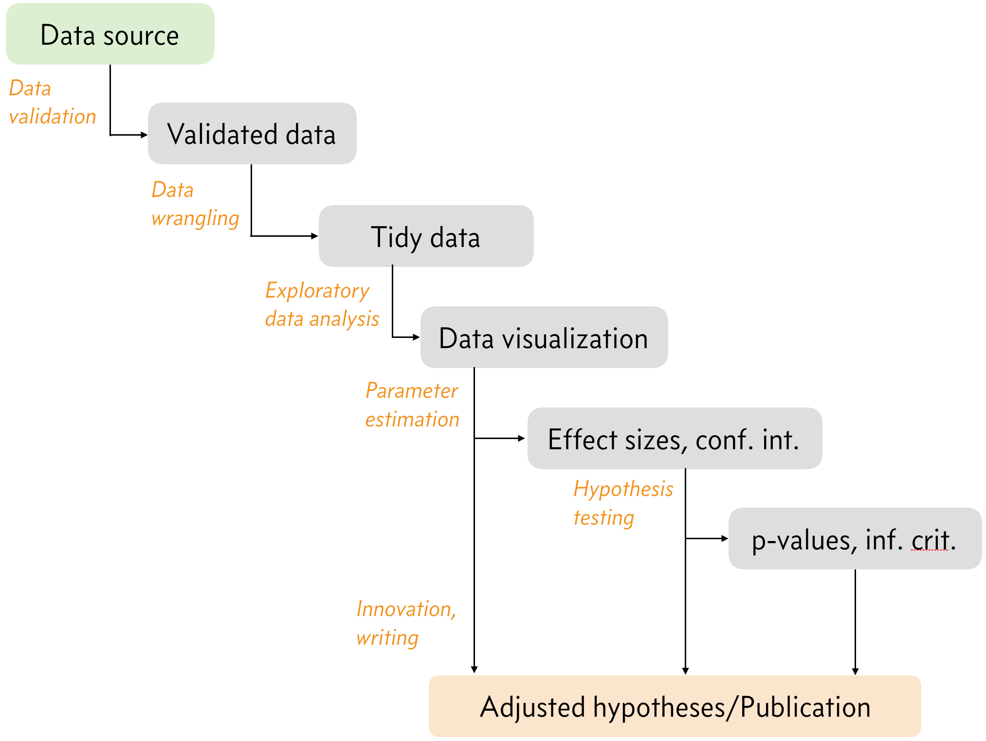 Let’s consider the lower right arrow in the figure above, going from a data set to updated hypotheses and parameter estimates, the heart of this course. We zoom in on that arrow, there are several steps, which we will call a data analysis pipeline, depicted below.